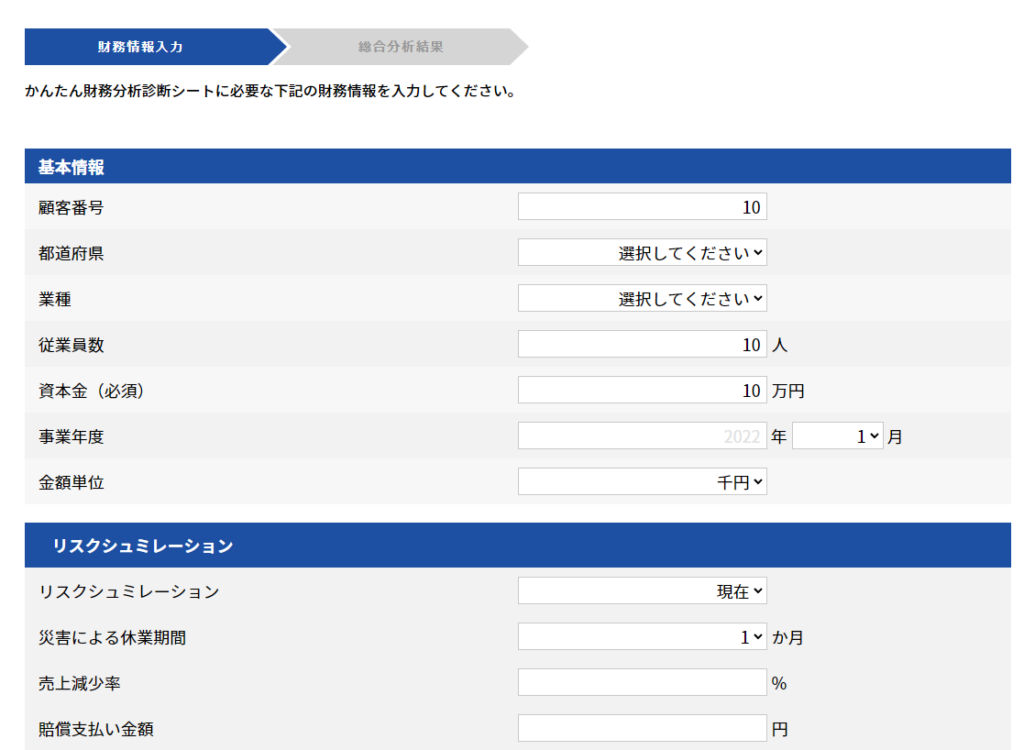 基本情報と決算書情報(貸借対照表、損益計算書、前年度指標)を入力してください。