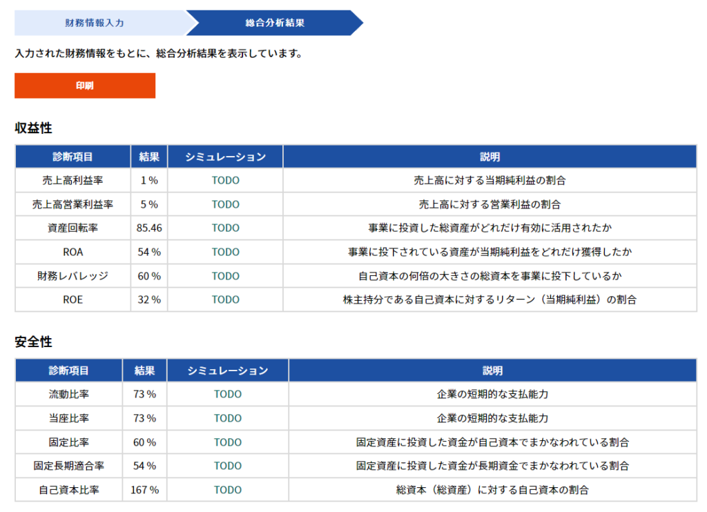 決算書の財務情報から、「収益性」「効率性」「生産性」「安全性」「成長性(前年指標を入力した場合のみ)」の総合分析結果が表示されます。